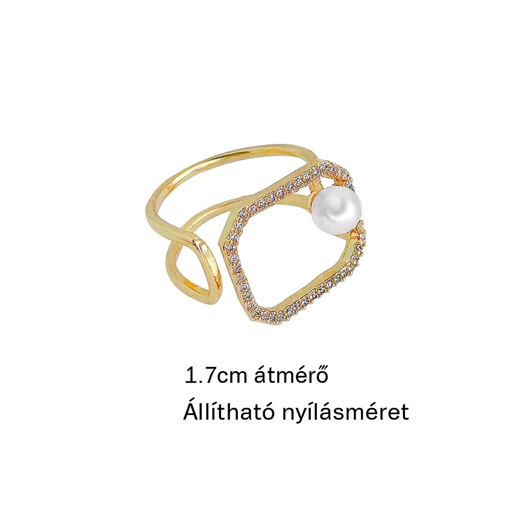 A nyolcszögletű forma apró, csillogó cirkóniákkal van kirakva, középpontjában egy elegáns gyönggyel, amely finoman kiemeli a kéz nőies vonalait. Tökéletes választás mindennapi viseletre vagy különleges alkalmakra.