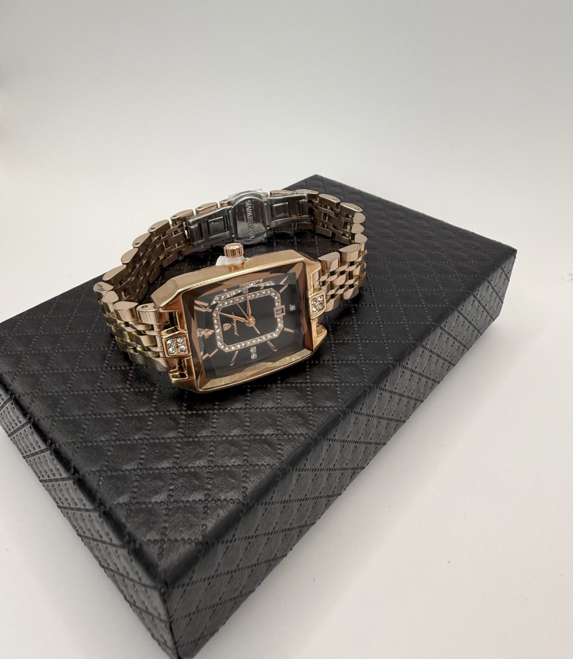 Fekete-arany színű, rozsdamentes acél szíjjal és téglalap alakú, kristályokkal díszített számlappal, amely minden megjelenéshez luxusfényű részletet ad.