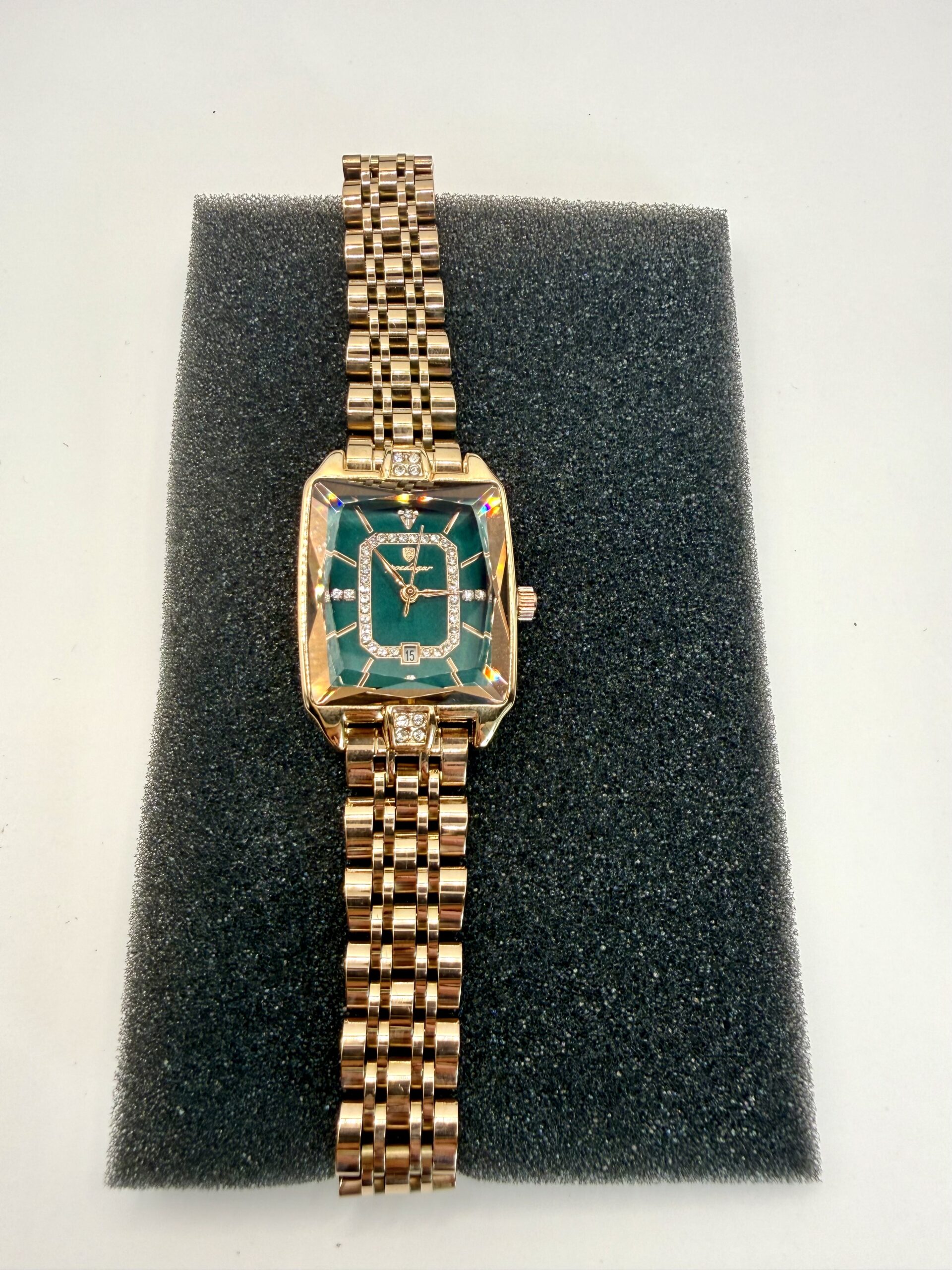 Smaragd zöld színű, rozsdamentes acél szíjjal és téglalap alakú, kristályokkal díszített számlappal, amely minden megjelenéshez luxusfényű részletet ad.