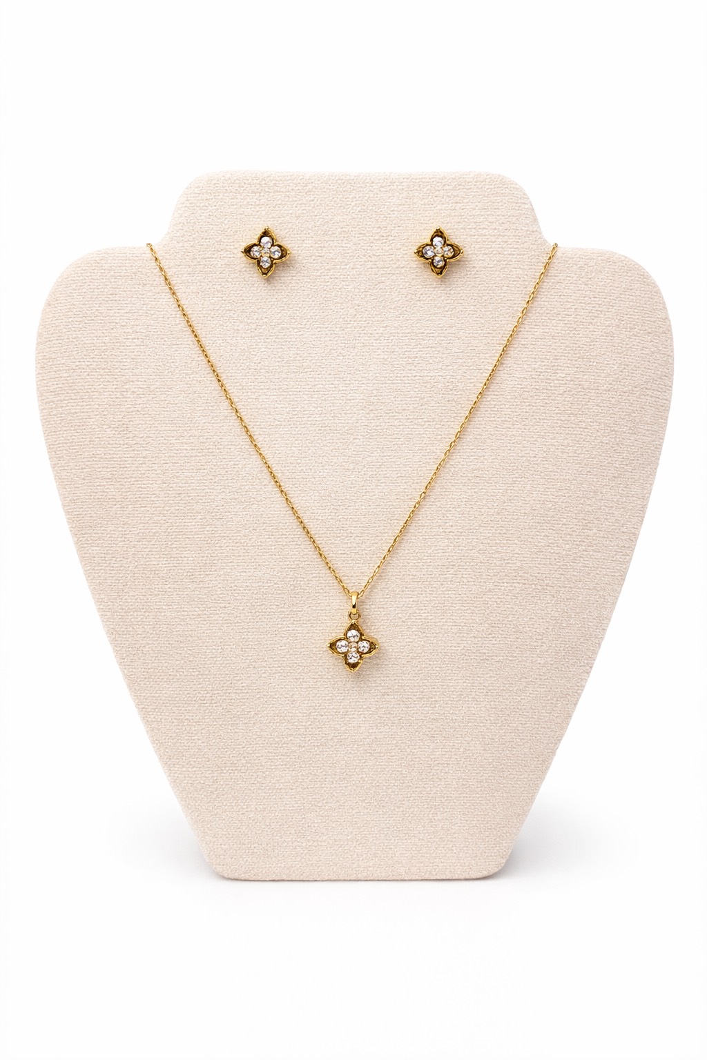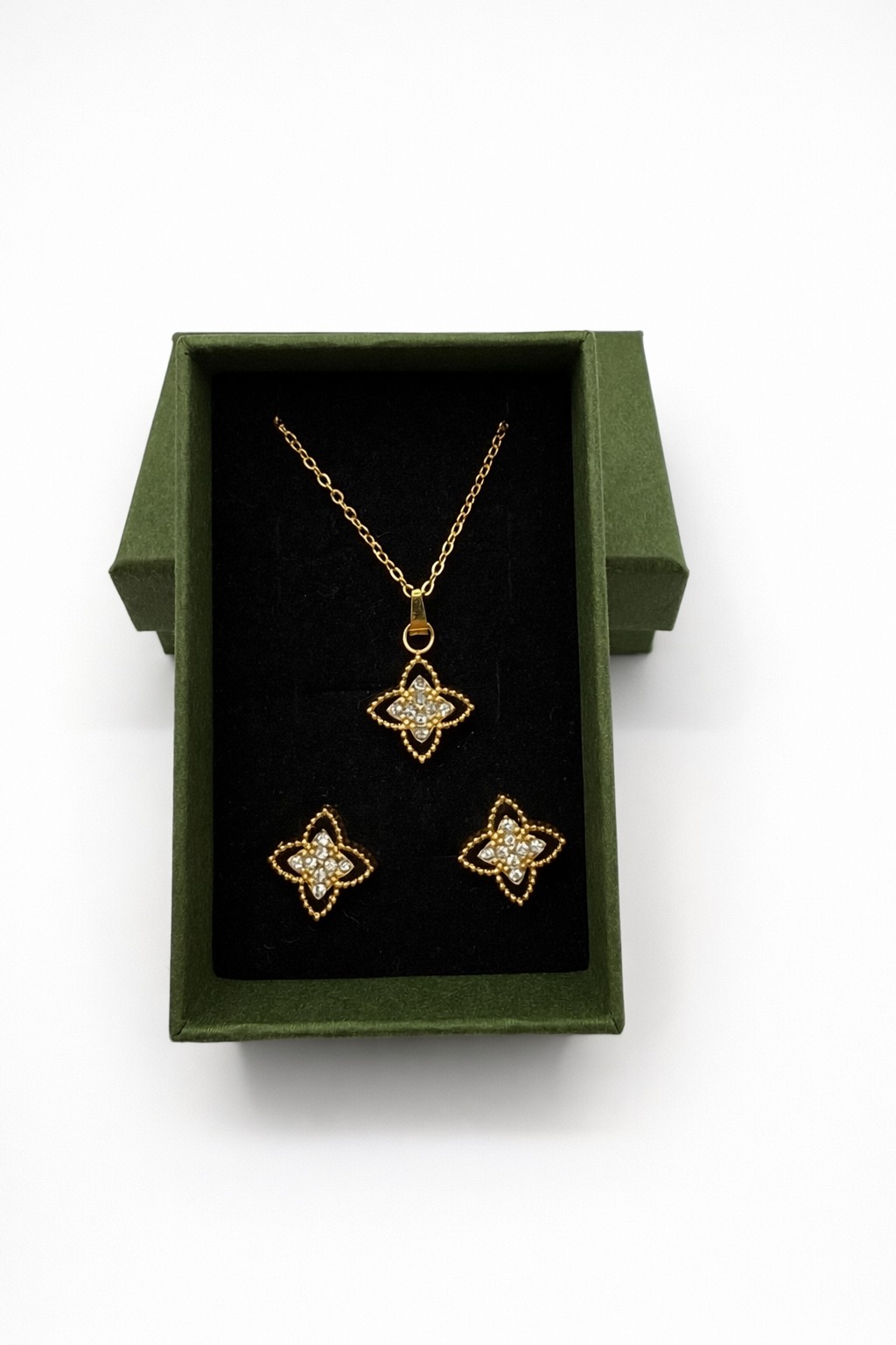 Letisztult aranyszínű ékszerszett nyaklánccal és fülbevalóval. Finom virágmotívum, csillogó köves középrésszel. Könnyű viselet, jól kombinálható hétköznapi és alkalmi öltözékkel is.