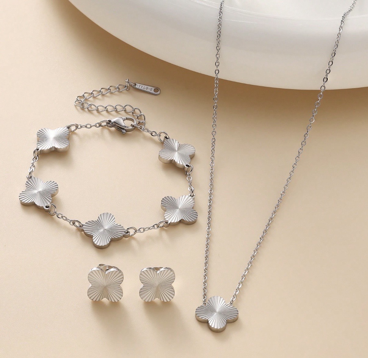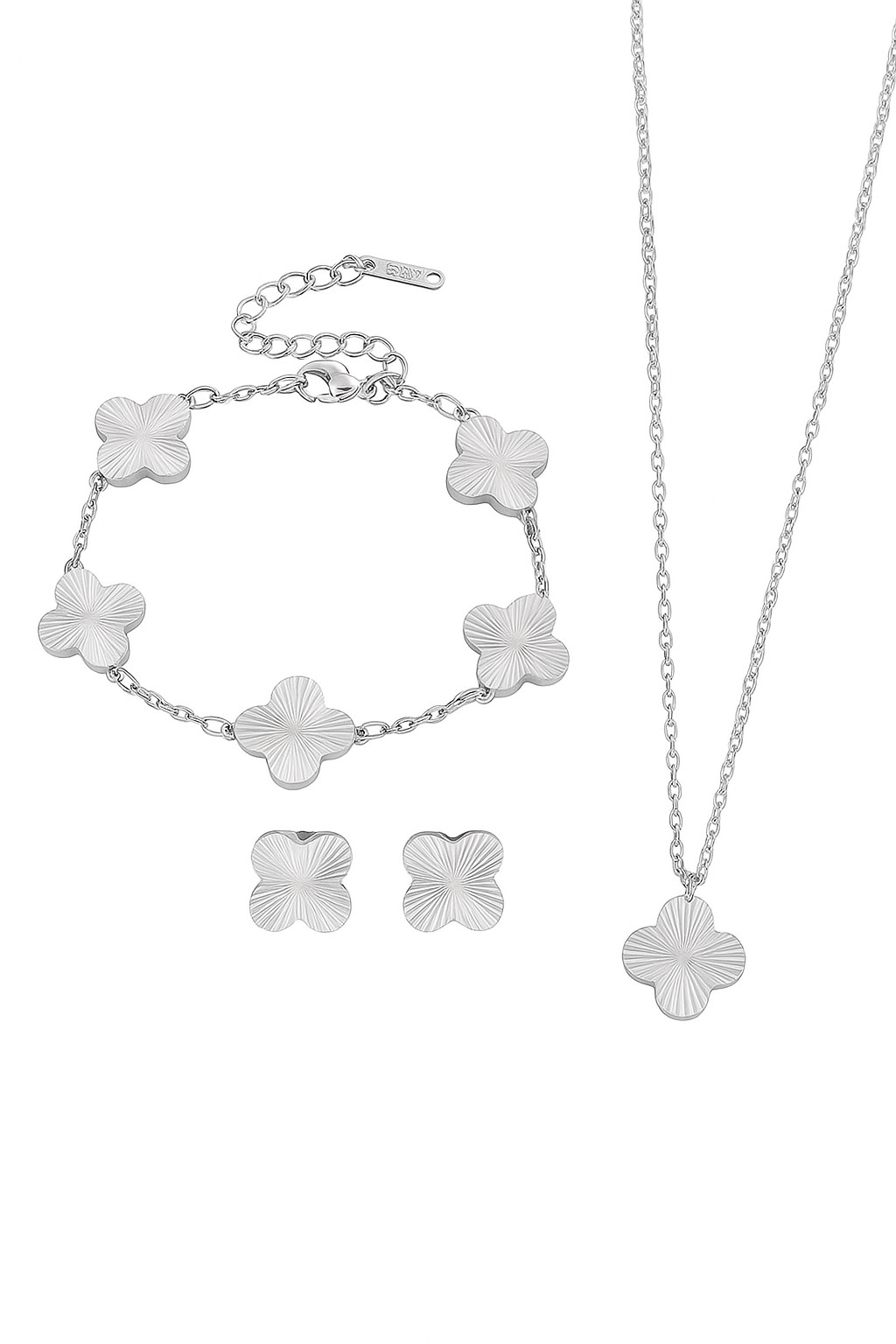 Kézzel készített, polírozott rozsdamentes acél négylevelű lóhere nyaklánc, karkötő és fülbevaló szett. Időtlen stílus és finom ragyogás, amely tökéletes választás a mindennapokra és különleges alkalmakra is. Minden ékszerünket ajándék ékszerdobozban küldjük!