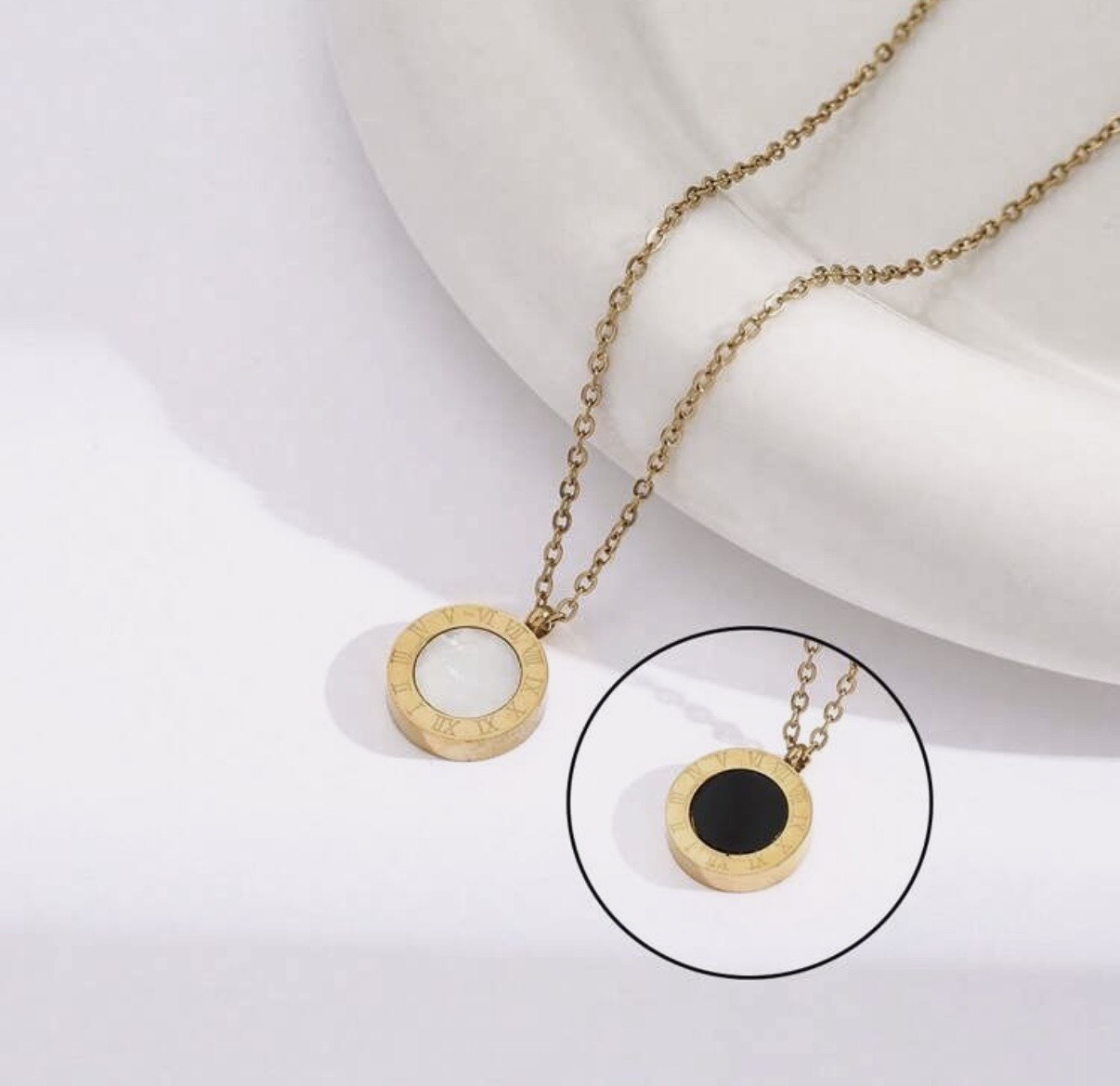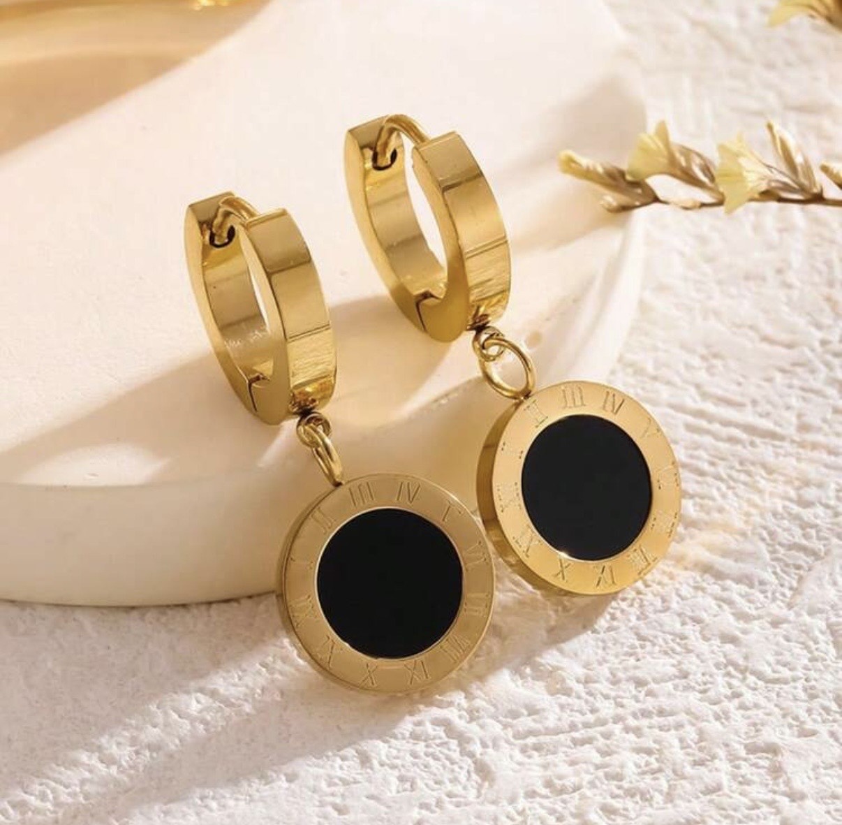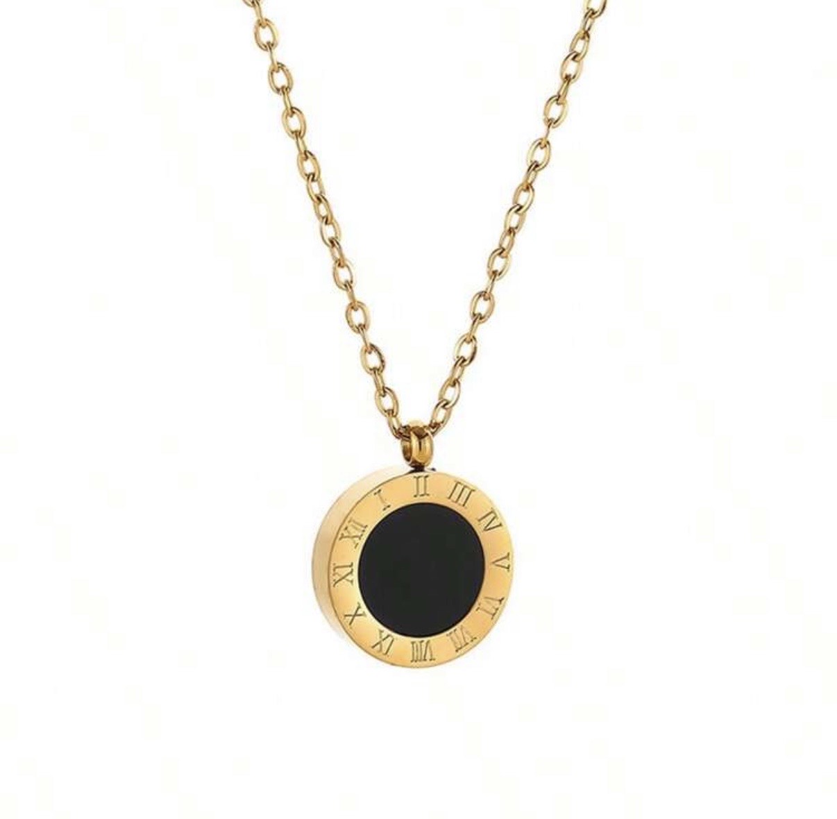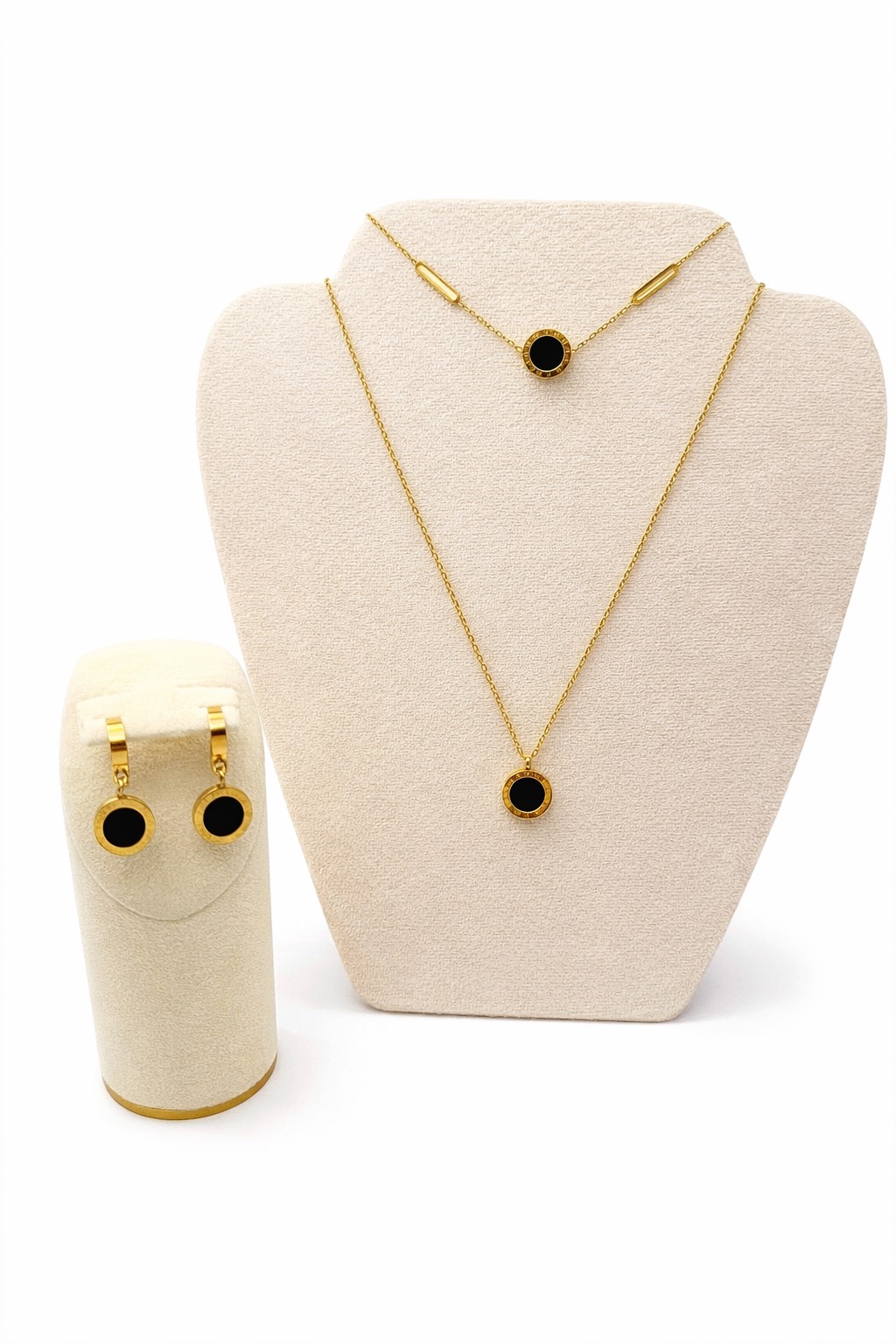 Aranyszínű ékszerszett nyaklánccal, karkötővel és fülbevalóval. Letisztult kör formájú medálok fekete betéttel. Elegáns megjelenés, jól illeszkedik hétköznapi és alkalmi viselethez is.