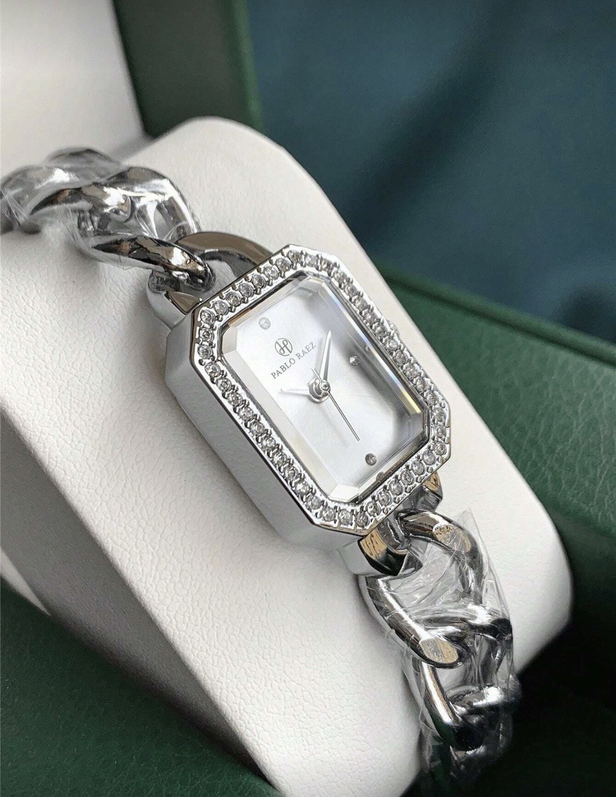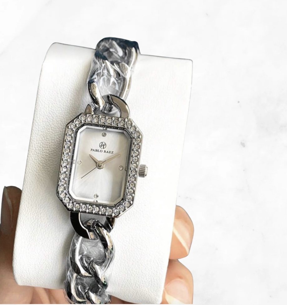 Elegáns, strasszos rozsdamentes acél karkötőóra fehér számlappal.